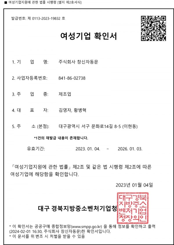 여성기업 확인서 작성자최고관리자 댓글 0건 조회 197회 작성일 24-10-22 13:21 여성기업 확인서 목록 이전글벤처기업확인서 24.10.22 다음글특허증(제10-2609687호) 24.10.21 댓글목록 등록된 댓글이 없습니다.